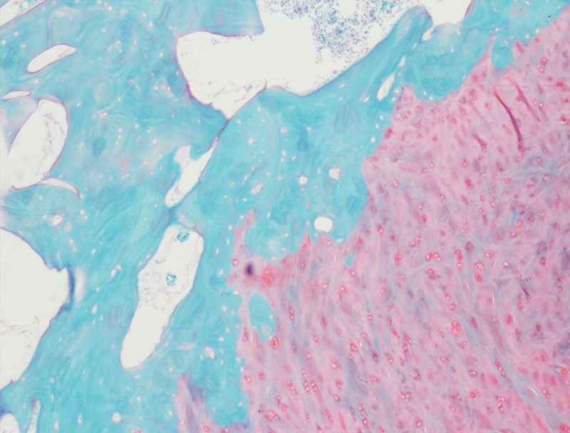番红-固绿(软骨)染色法的染色原理在于嗜碱性的软骨和碱性染料番红O结合呈现红色,嗜酸性的骨和酸性染料固绿结合而成绿色或者蓝色,与呈现红色的软骨对比鲜明,从而将软骨组织和骨组织区分开。番红O是一种结合多阴离子的阳离子染料,其显示软骨组织是基于阳离子染料与多糖中阴离子基团(硫酸软骨素或硫酸角质素)结合。番红O着色与阴离子的浓度近似成正比关系,间接反映基质中蛋白多糖的含量和分布。当软骨收到损伤时,软骨中的糖蛋白会释放出来,使基质成分分布不均匀,从而导致番红O淡染或不着色。通过图像分析软件可以对番红O染色的软骨基质进行定量分析。固绿与胶原纤维结合,不宜褪色。