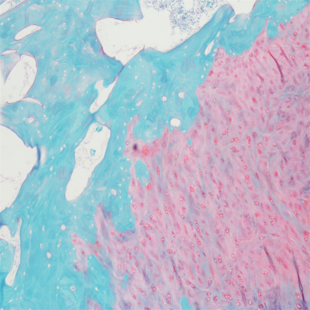 番红-固绿染色(软骨)在涉及关节软骨及软骨下骨的形态学研究中,常需联合使用多种染料以显示其组织学结构。其中,起源于上世纪60年代的番红O(safranin O)-固绿(fast green)染色因可以直观反映关节软骨、软骨下骨和骨组织的结构而备受青睐。软骨呈红色,成骨呈绿色。