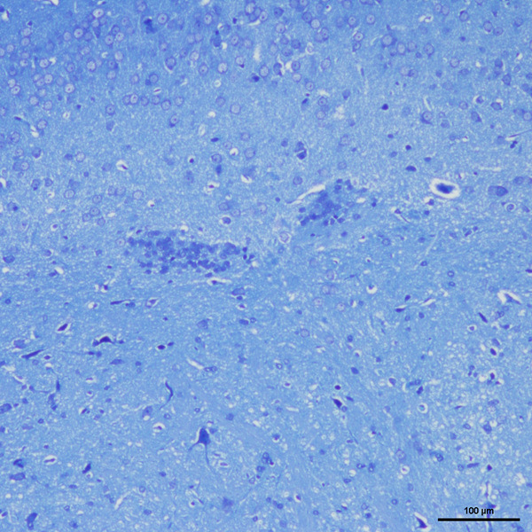 5¡¢HEȾɫ·½·¨ËäȻҲÄܹ۲쵽°ûÖÊÖÐÊȼîÐÔ¿ÅÁ££¬µ«½á¹¹²»ÉõÇåÎú£¬Éñ¾ÔªµÄÖáÍ»¡¢Ê÷Í»ÄÑÒÔ±æÈÏ¡£ÔÚÄáÊÏȾɫÖÐÄáÊÏÌåÇåÎú¿É±æ£¬¶øÇÒºÜÈÝÒ×Çø·ÖÖáÍ»ºÍÊ÷Í»¡£ÄáÊÏȾɫÖÐÄáÊÏÌåÊÜȾºó³Ê¿é×´£¨ÐÎÈ绢°ß£©»ò¿ÅÁ£×´£¬ºËÖÜΧÄáÊÏÌå¿ÅÁ£½Ï´ó£¬½ü±ßÔµ´¦½ÏС¶øÏ¸³¤£¬ÈçÔÚÉúÀíÇé¿öÏ£¬ÄáÊÏÌå´ó¶øÊýÁ¿¶à£¬·´Ó³Éñ¾Ï¸°ûºÏ³Éµ°°×ÖʵŦÄܽÏÇ¿£¬ÔÚÉñ¾ÔªÊÜËðʱ£¬ÄáÊÏÌåµÄÊýÁ¿¿É¼õÉÙÉõÖÁÏûʧ¡£